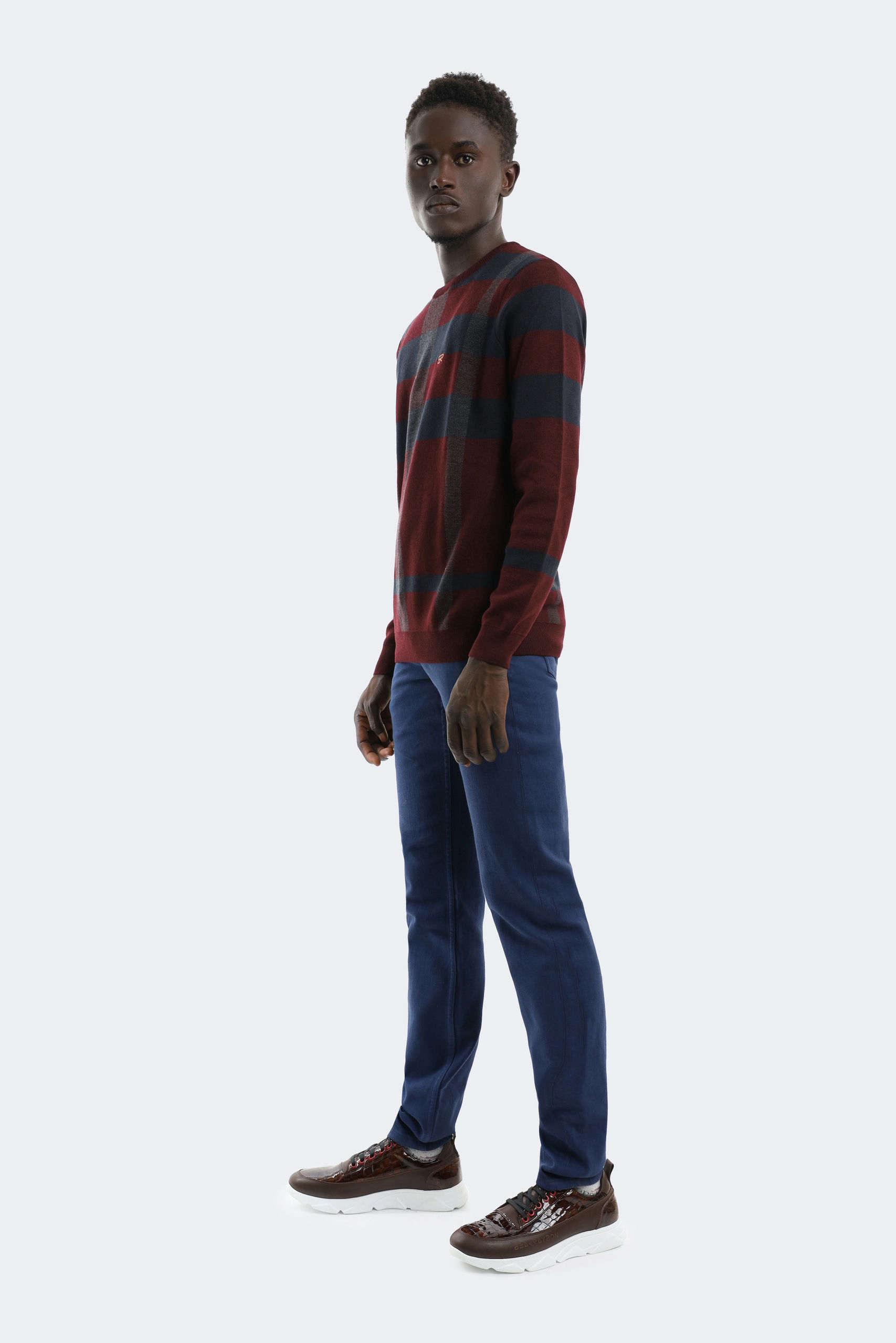 Designed with modern and sophisticated lines, this knitwear is the perfect choice for those looking for an elegant style. The elegant combination of deep burgundy and dark gray tones draws attention with its rich texture. Its subtle checkered pattern offers a timeless style with its minimalist lines, allowing you to make a statement in any environment. The high-quality craftsmanship and soft texture offer all-day comfort and a luxurious feel. This sweater is the ideal piece to add an elegant touch to your everyday outfits.