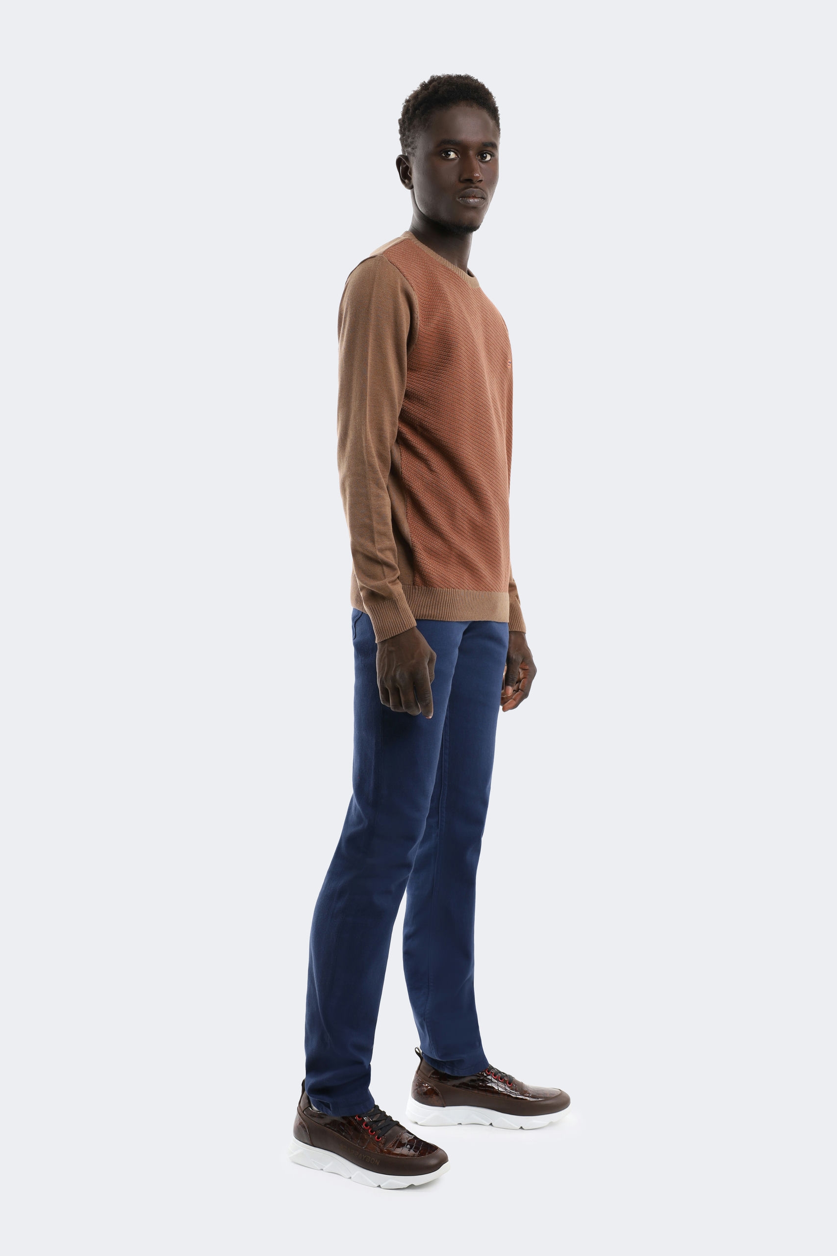 This elegant brown crewneck sweater combines sophisticated style and everyday comfort. With its carefully designed textured pattern and ribbed cuffs, it offers both a stylish and comfortable look. The small logo on the left chest adds an elegant touch to this piece. Whether you wear it to work or on a weekend outing, this sweater will turn heads in any setting.