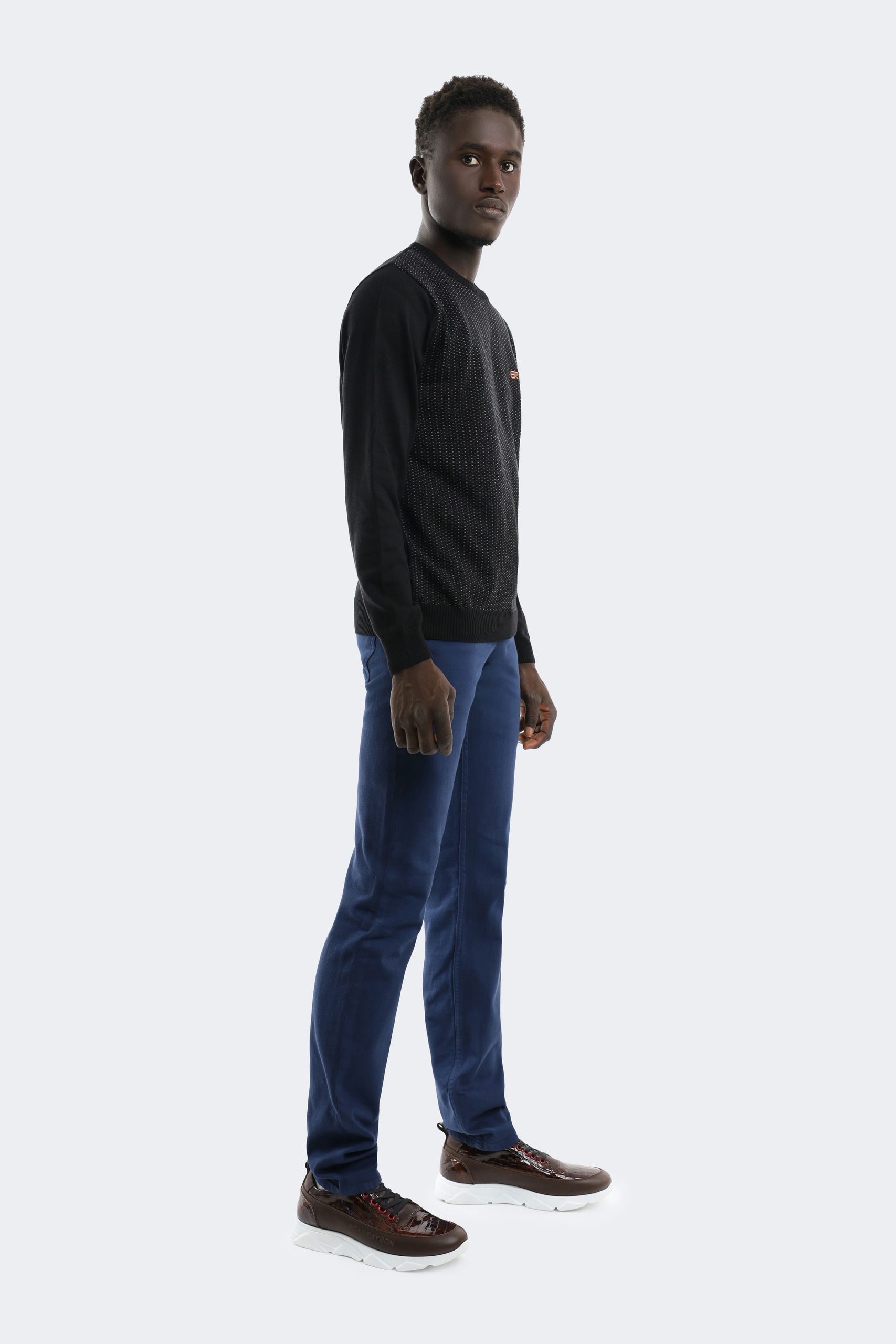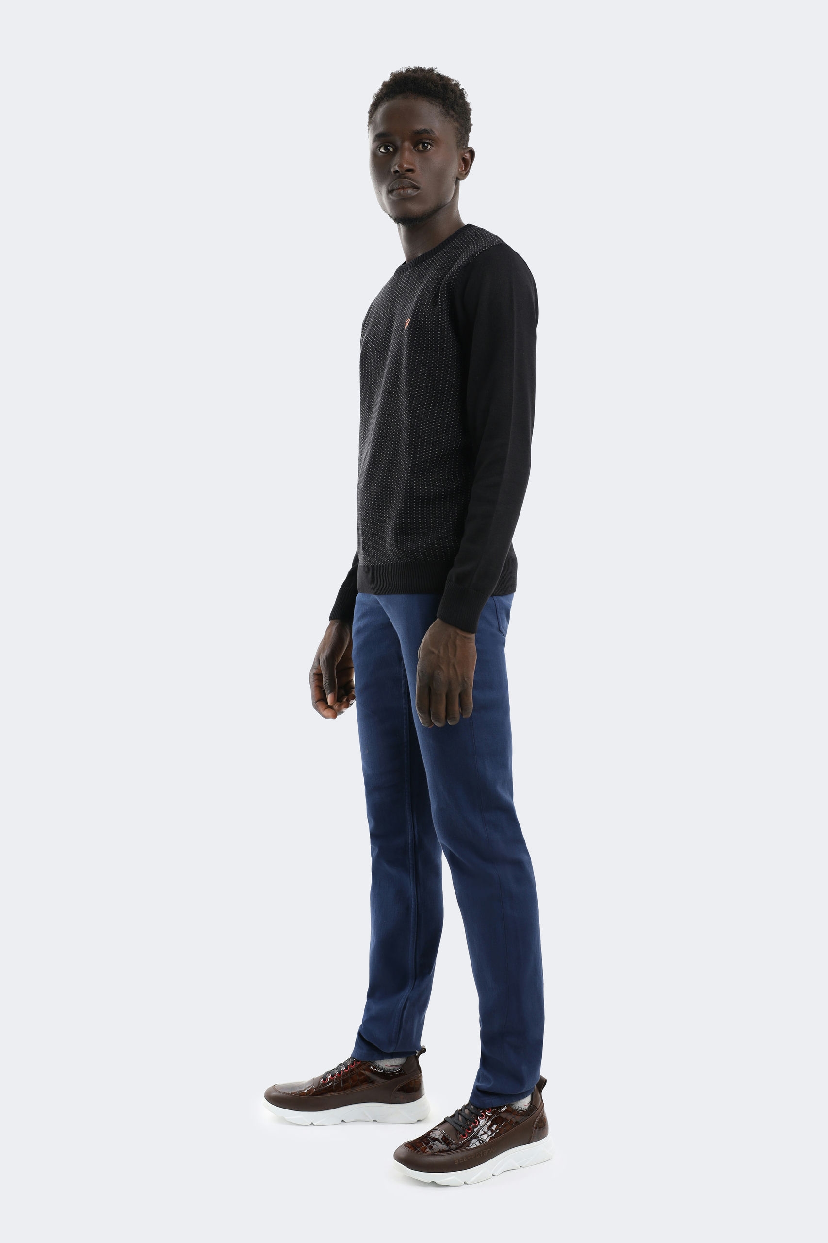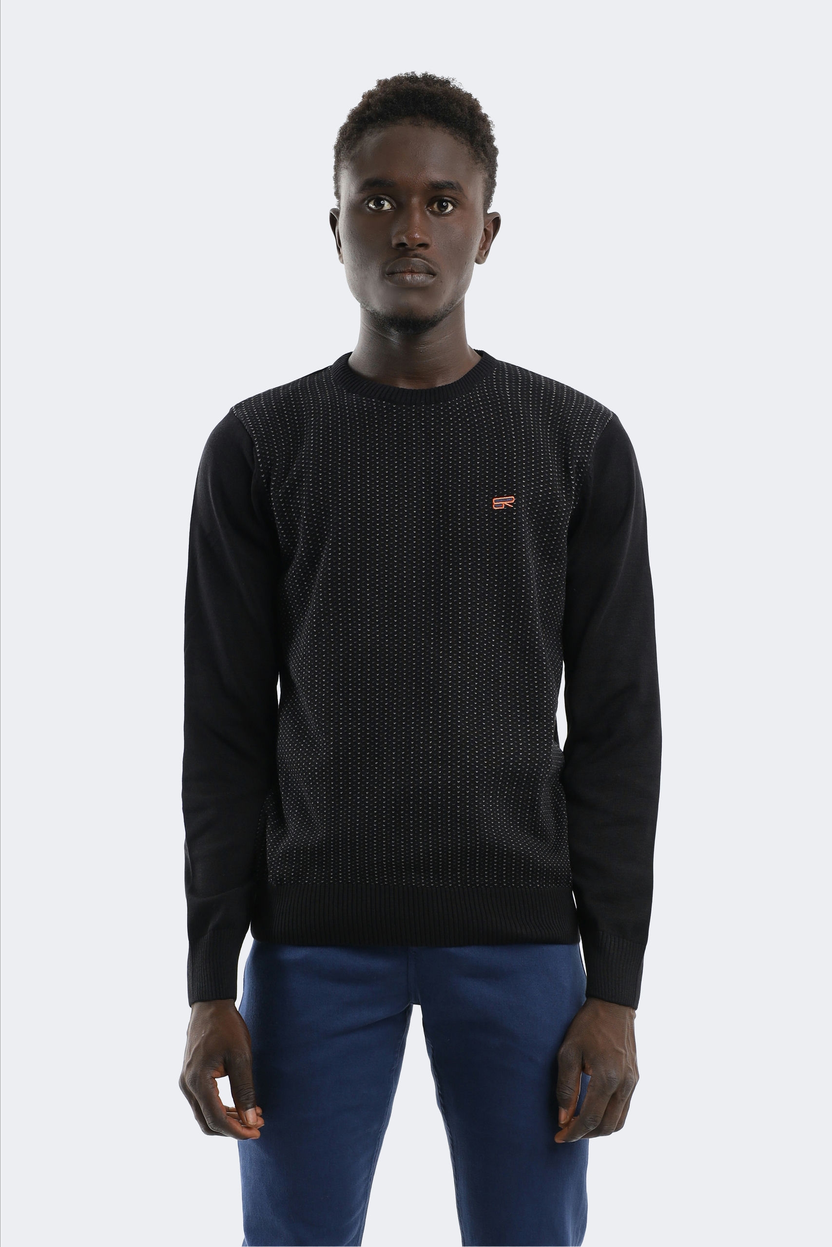 This black sweater combines elegant minimalism and refinement in details. The front panel decorated with modern geometric patterns adds a sophisticated touch to its simple look. With its soft texture and perfect fit, it provides comfort for everyday wear and creates a stylish look for elegant events. With its quality craftsmanship and fine details, this sweater will take a timeless place in your closet and will make you feel special in any environment.