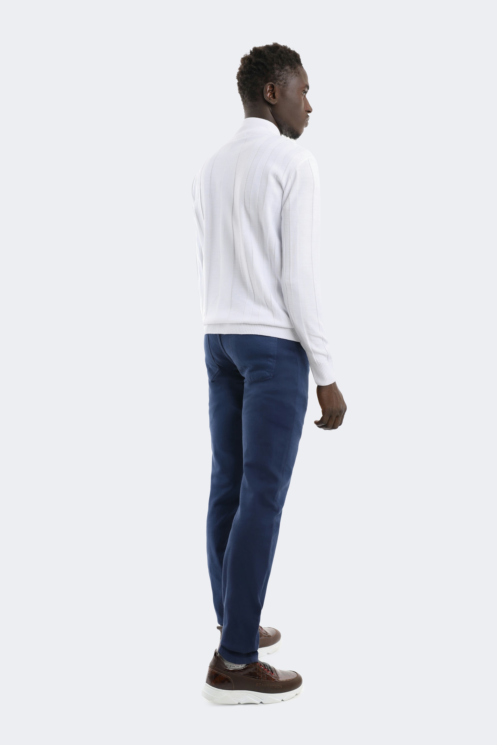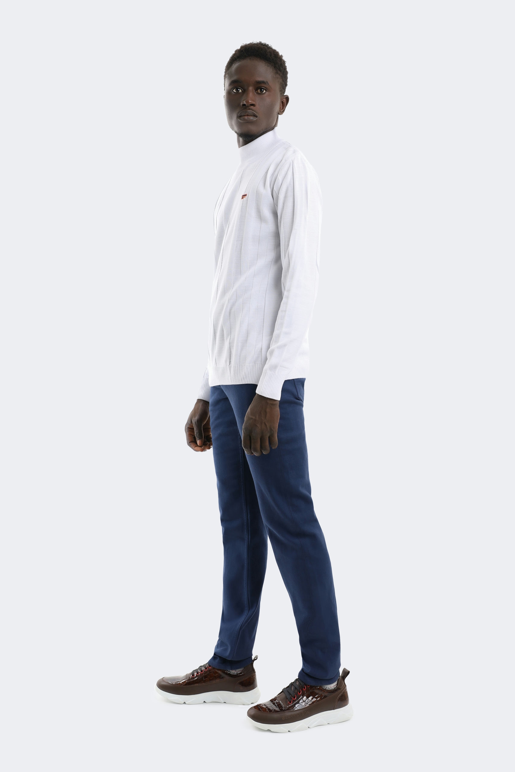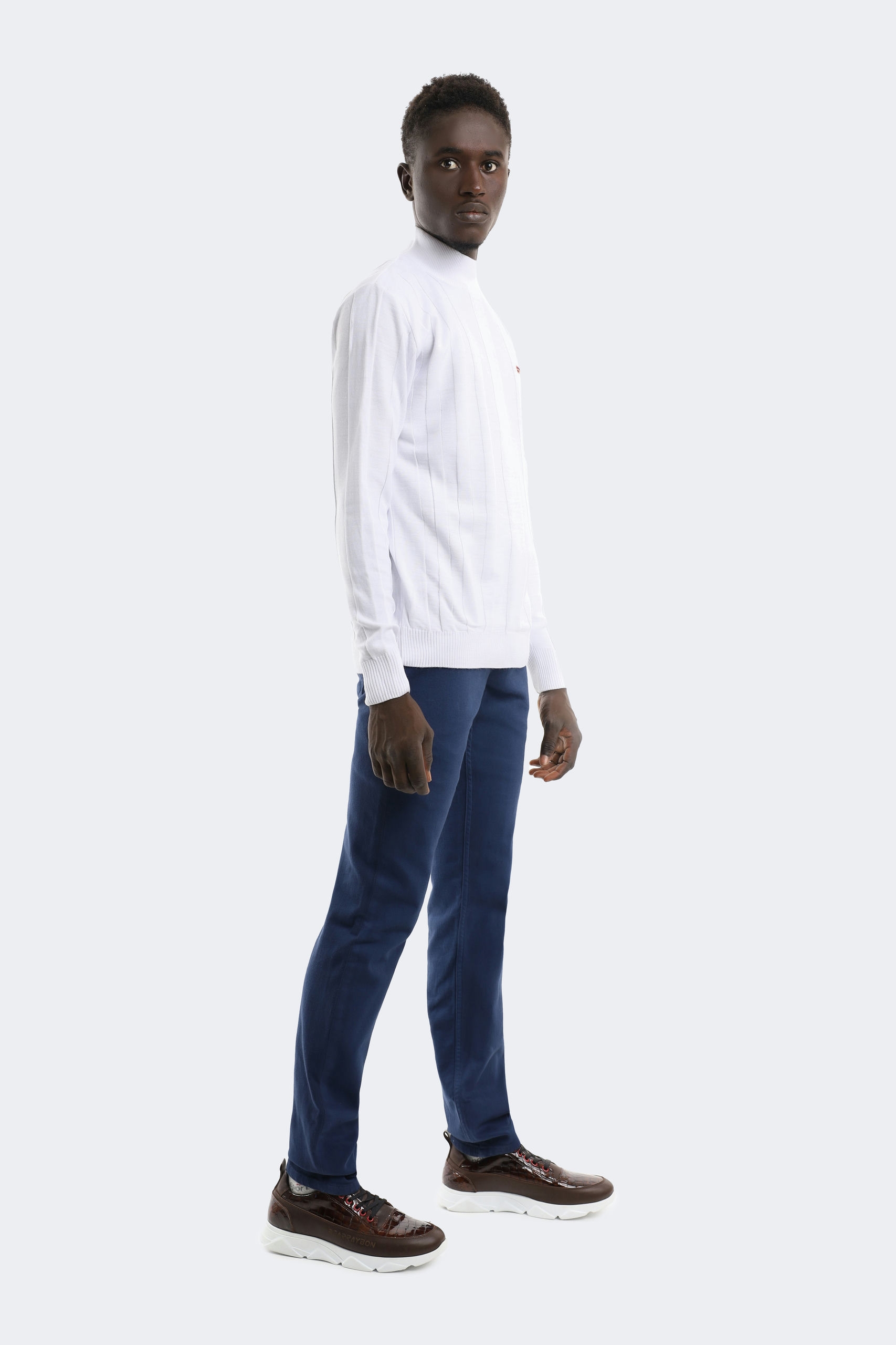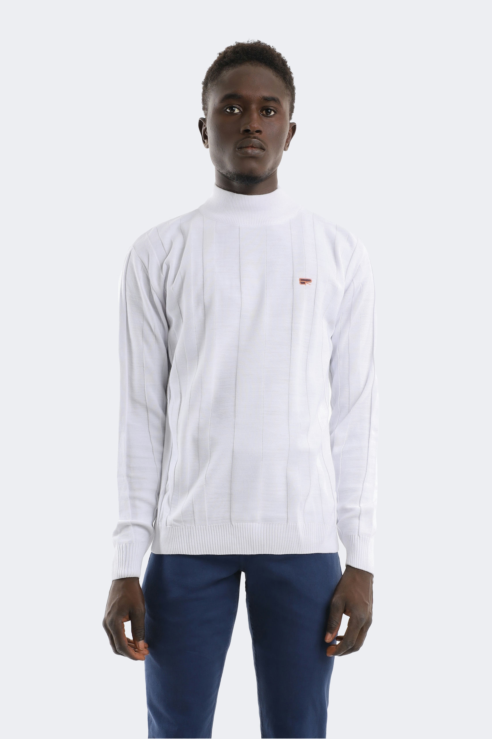 This high-neck sweater combines classic lines with a modern design. Creating a slim and long silhouette with its vertical patterns, this sweater offers both elegance and comfort at the same time. The small logo detail on it adds an elegant touch to its minimal design, while the soft fabric keeps you warm on cold days. Pairing perfectly with jeans or classic trousers, this piece is a candidate to be indispensable for both your daily and business outfits.